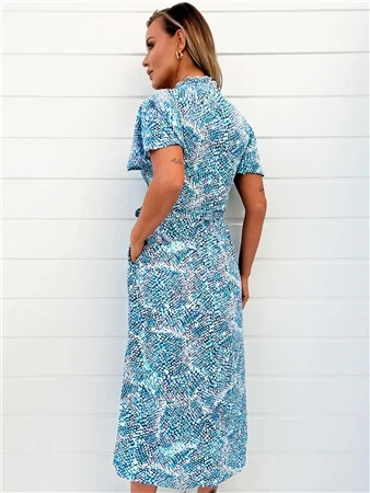 Stay on trend in our Blue Printed Short Sleeve Belted Button Up Shirt Dress.