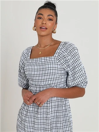 Brave Soul Pale Blue / Black Checked Seersucker Maxi Dress With Tie Detail