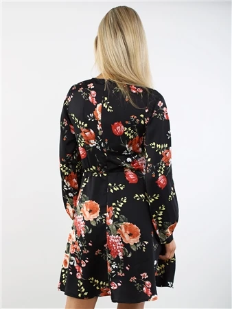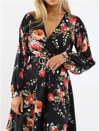 Get ready to brighten up your wardrobe with the Tammy Black Floral Long Sleeve Skater Mini Dress! This fun dress features a colorful print, buckle detail, skater skirt, and flattering wrap front. Long sleeves make it perfect for chilly days, and the bold print will add a pop of personality to any ensemble. Pair it with heels or trainers to complete the look.