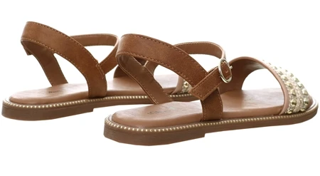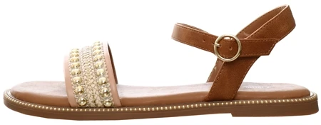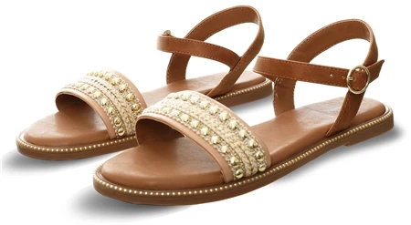 - Slip on sandal style with ankle strap and buckle fastening and strap over foot