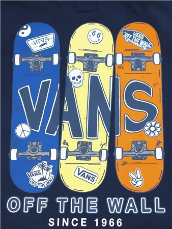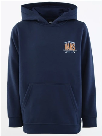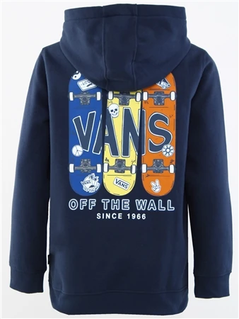 The Vans Boys Boardview Pullover Hoodie has long sleeves, a front pouch pocket and the Vans Off The Wall logo with imagery on the left chest and back